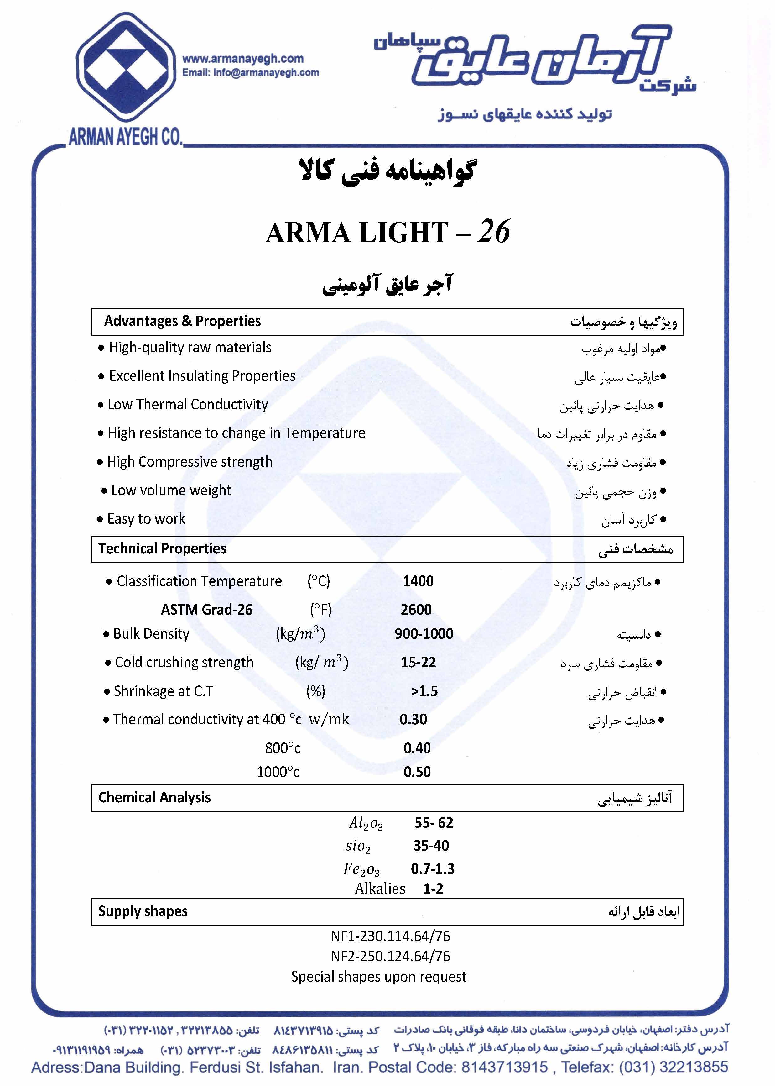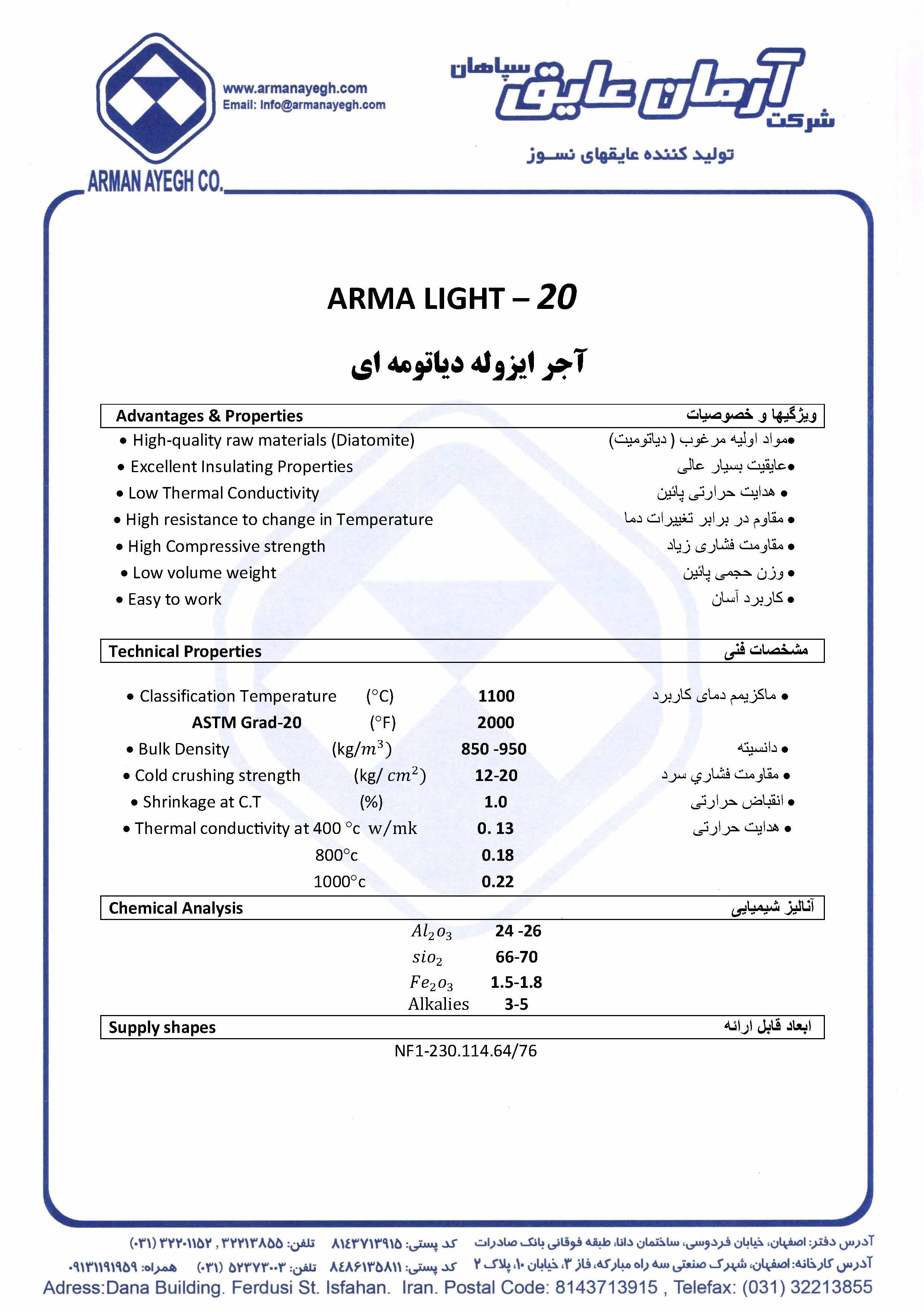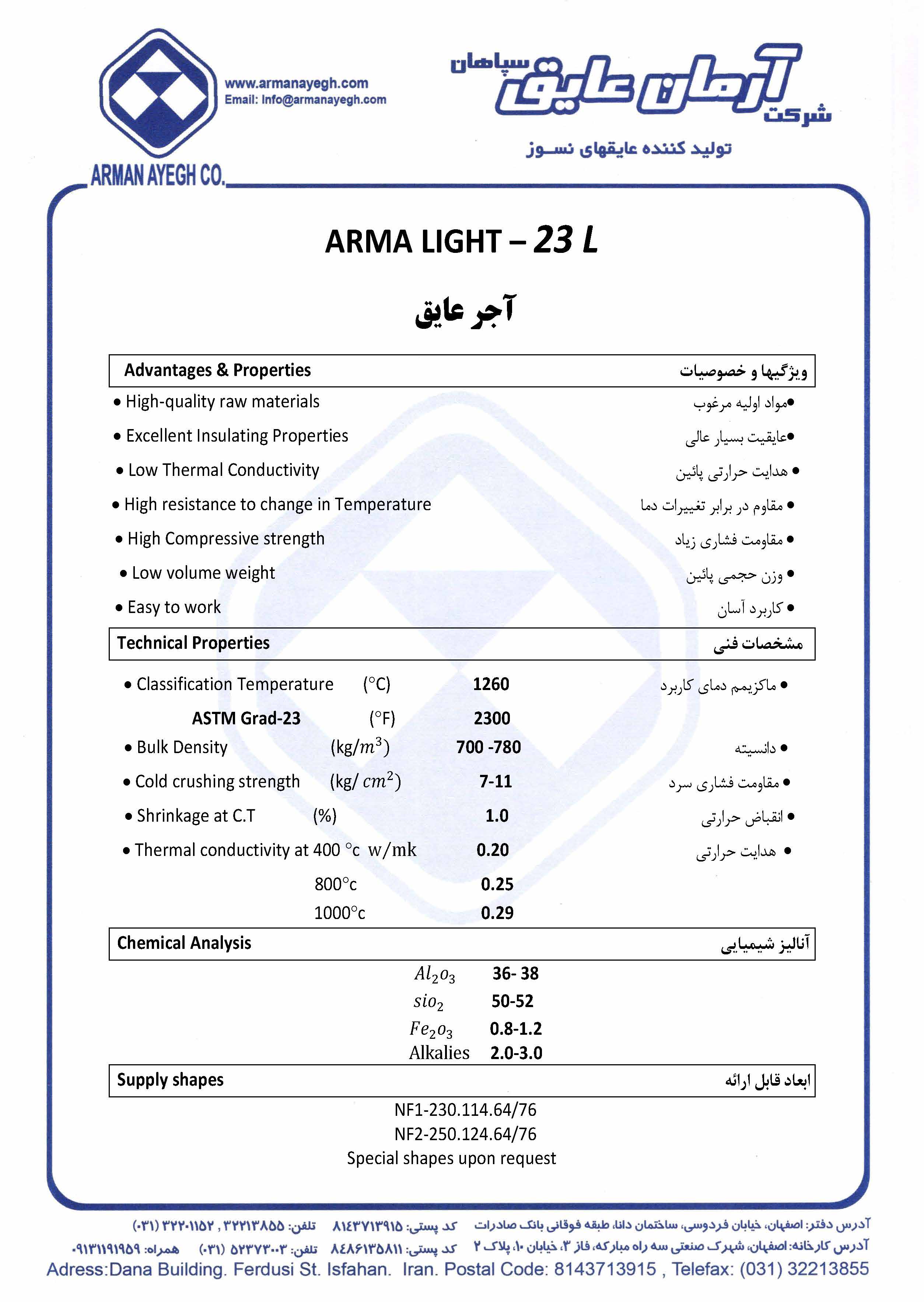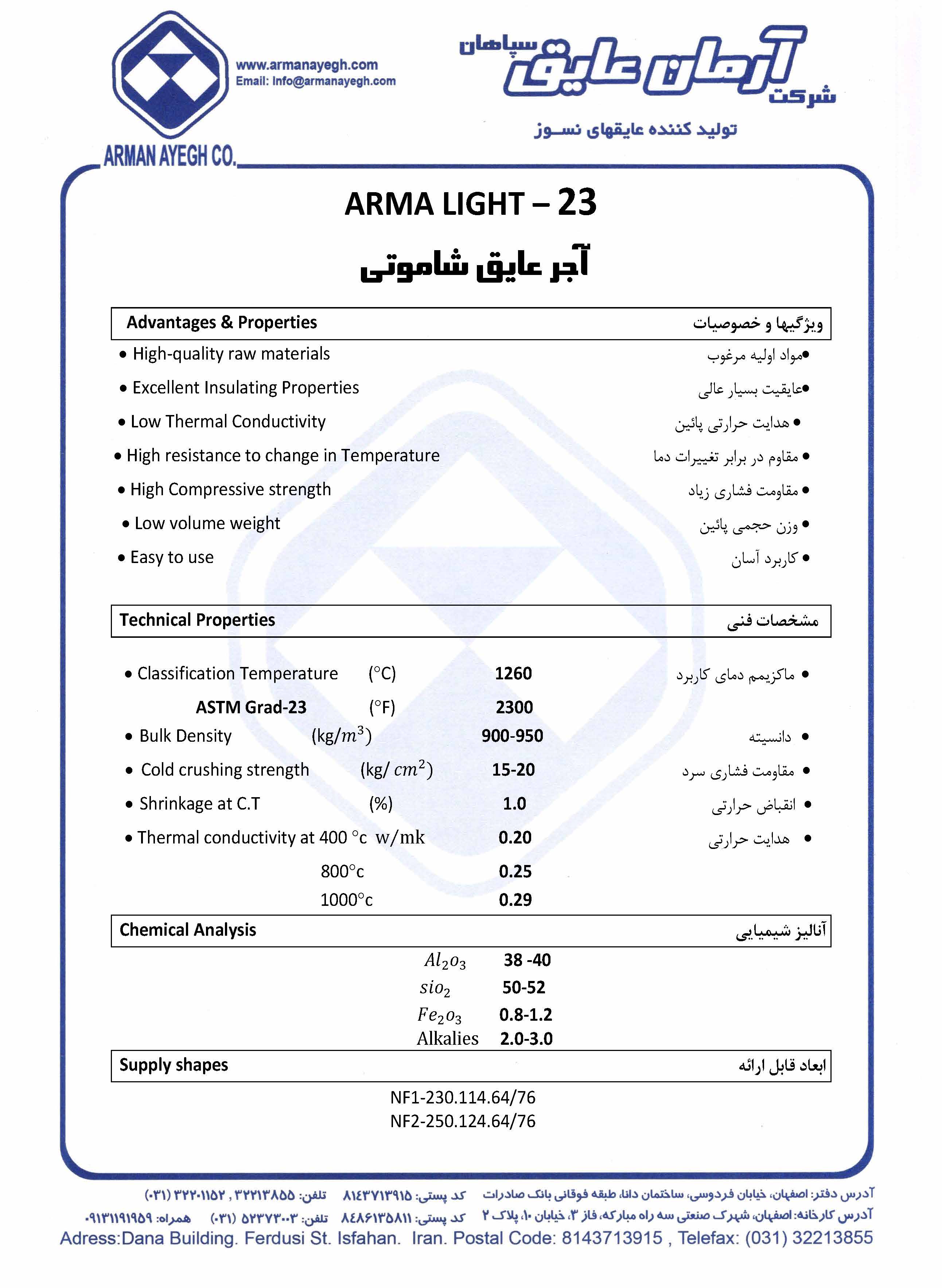 آجرهای عایق و نسوز که برای عایق بندی جداره کوره ها و پاتیل ها در صنایع جهت حفظ انرژی به کار گرفته می شود و در انواع شکل های ساده، کمانی و گوه ای تولید و عرضه می گردد.