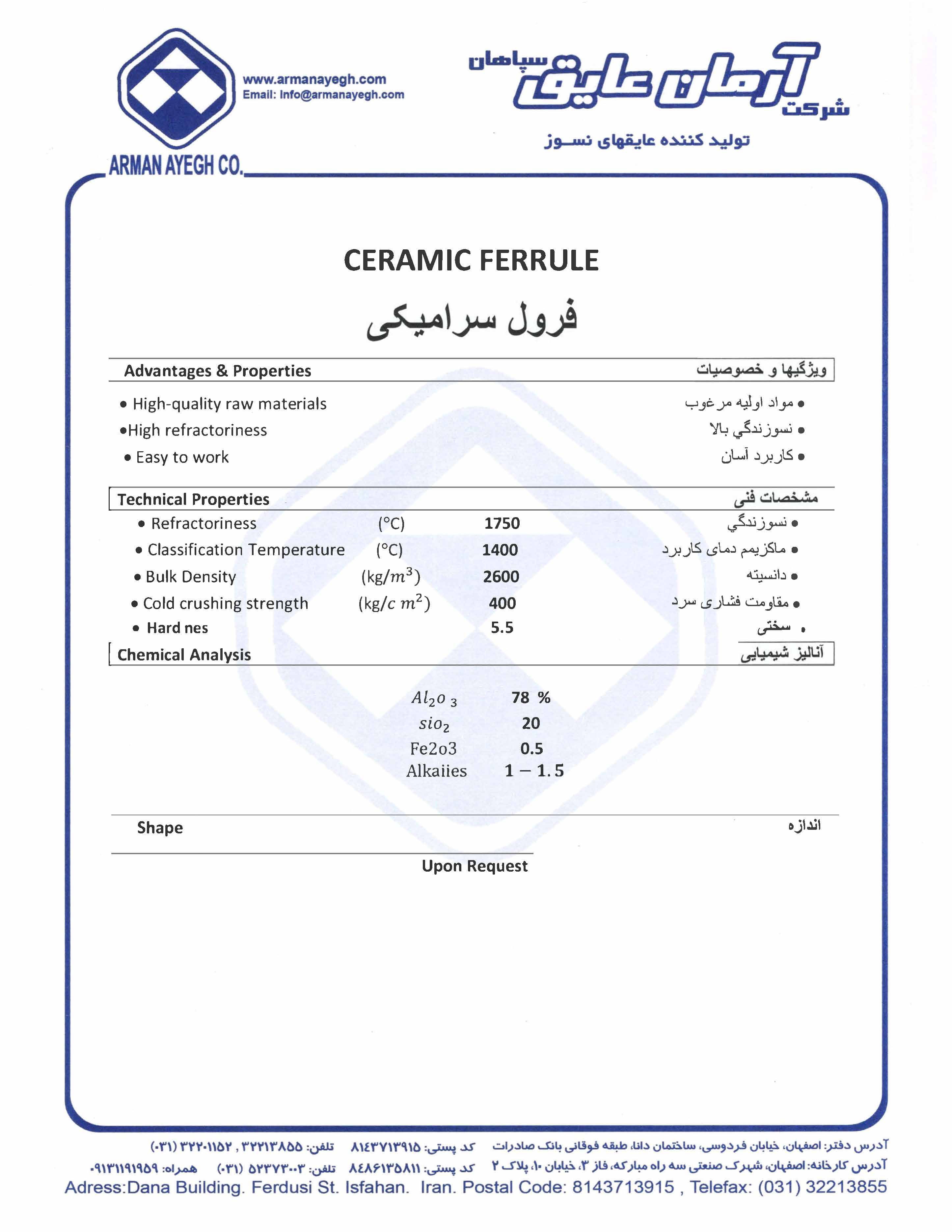 قطعات ریختنی نسوز با استفاده از جرم های ریختنی نسوز و عایق در اشکال مختلف قابل تولید و عرضه می باشد، همچنین قطعات سرامیکی و آلومینایی جهت استفاده در صنایع مختلف در اشکال متنوع قابل عرضه می باشد و عایق های ماشین کاری شده از جنس های سرامیک فایبر و کلسیم سیلیکات نیز بر اساس سفارش و نقشه قابل تولید و عرضه می باشند.