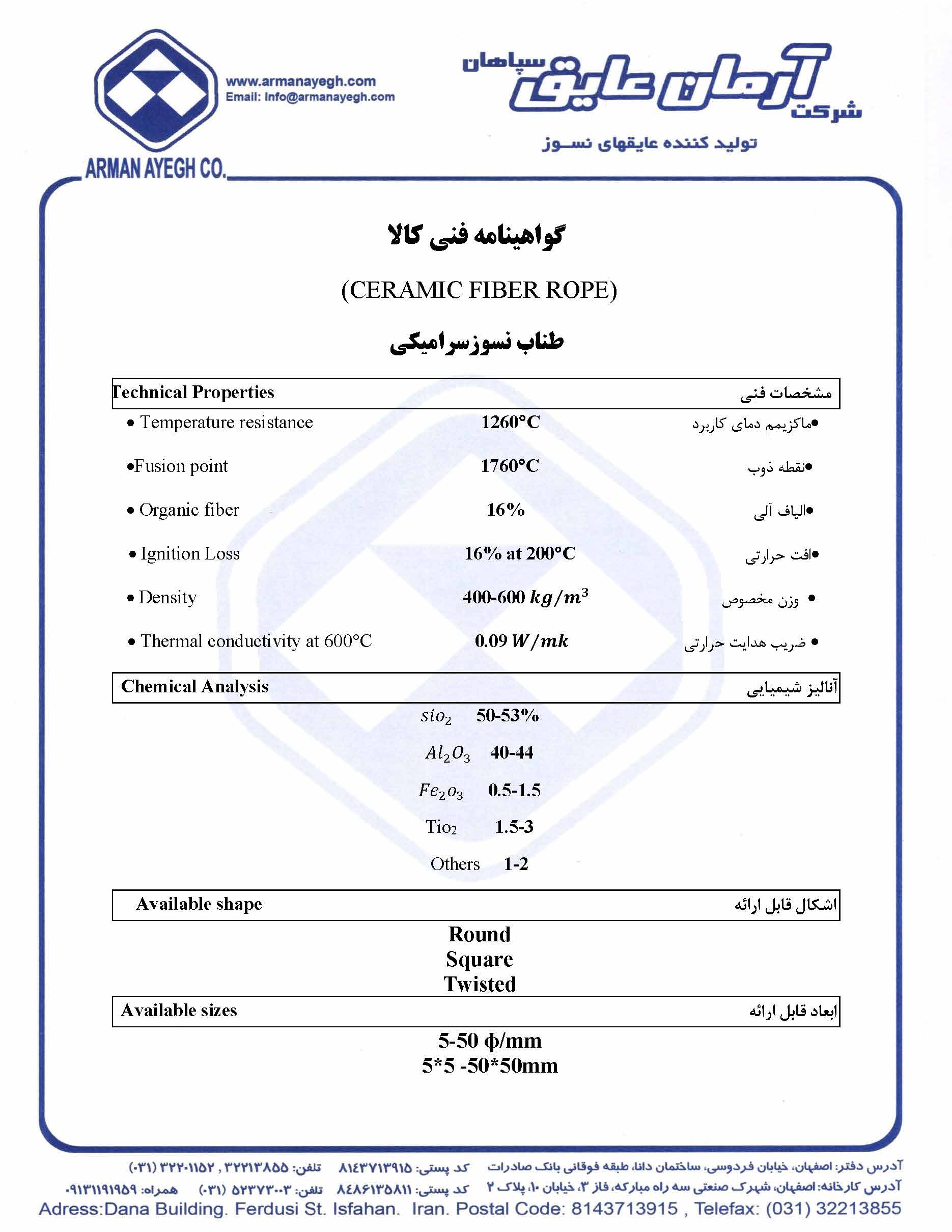 طناب های نسوز به دو شکل گرد و چهارگوش از سایز 4 الی 100 میلیمتر از جنس های سرامیک فایبر و فایبرگلاس قابل عرضه می باشد.